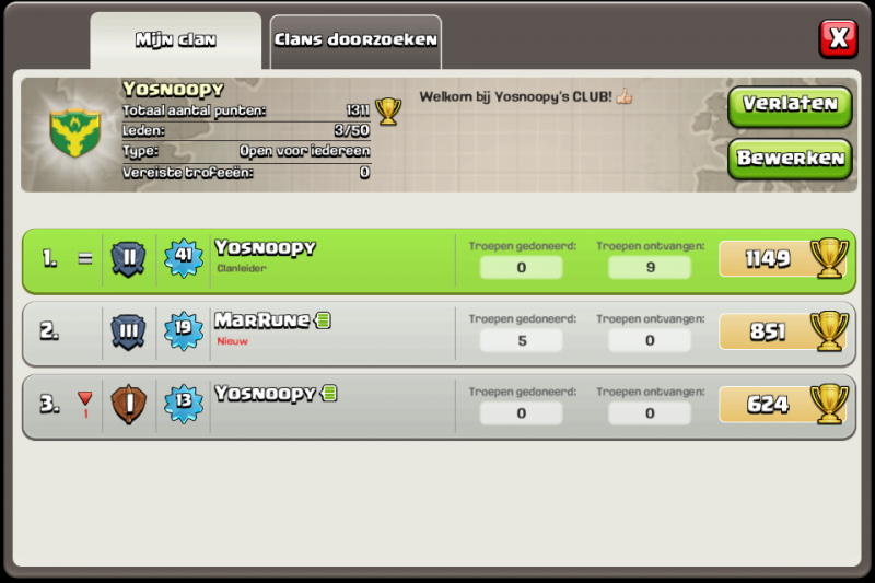 De vereiste trofeeën staan dan op 0 en ons Clanschild is geel.