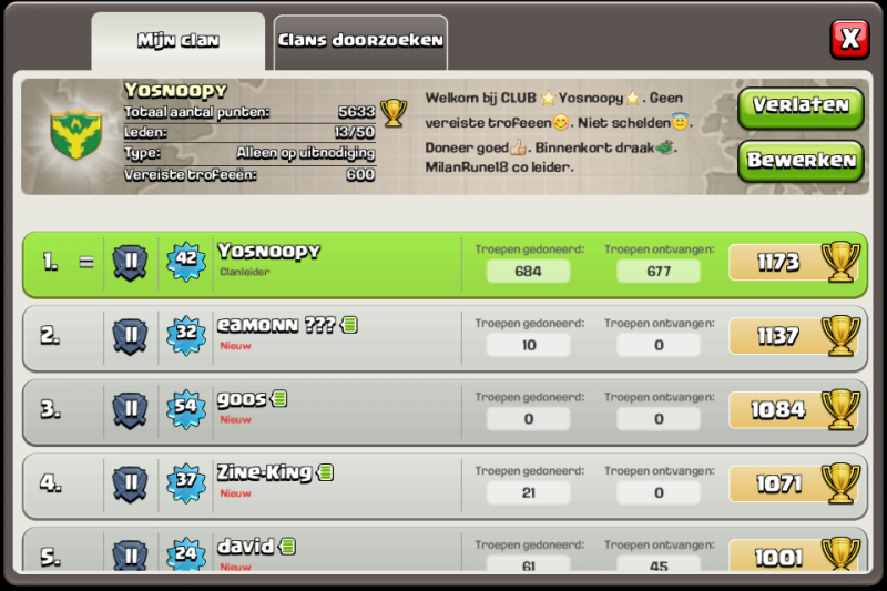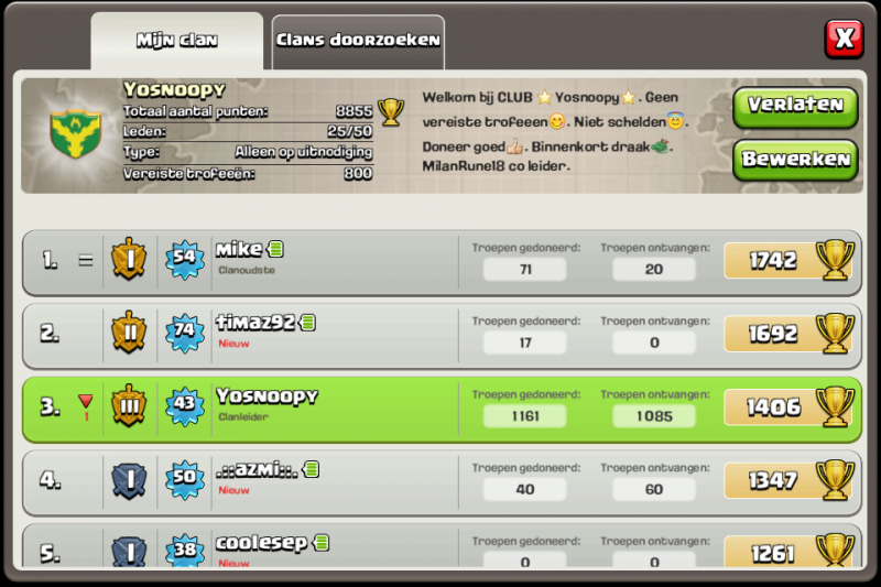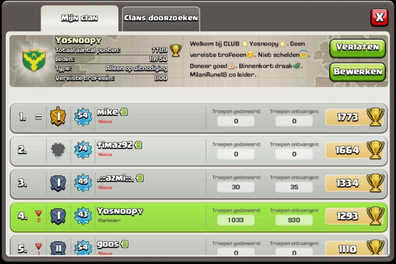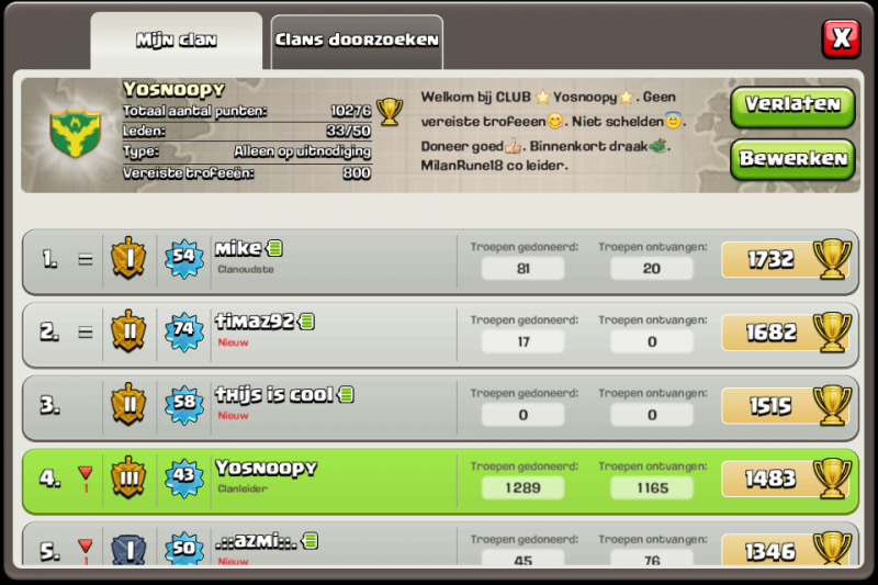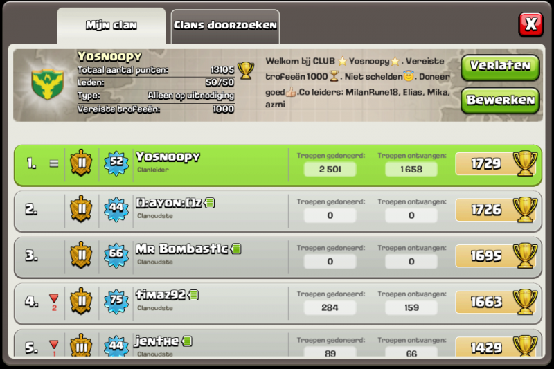 Hierboven een screenshot van onze Clan toen ik nog maar level 41 was xD